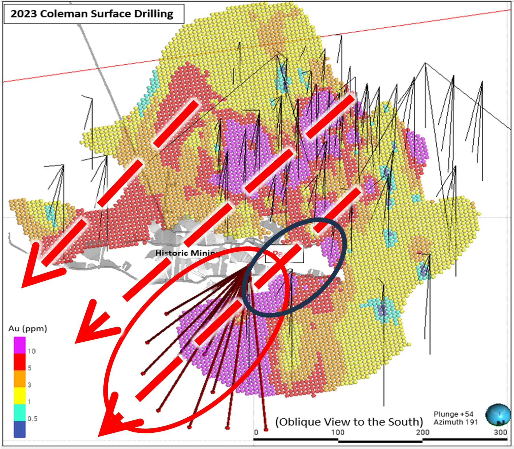 Rick Van Nieuwenhuyse further commented: “We will complete as much surface drilling as we can safely accomplish from this single drill pad on top of Box Mountain before winter weather conditions shut us down. The program is designed to extend known mineralization on the Coleman Segment of the Lucky Shot vein, and upgrade resources to a measured category so that we can incorporate into a proper mine plan. Future drilling of approximately 12,000 meters (39,000 feet) from underground at Lucky Shot is expected to be undertaken in 2024 to augment resources on the Lucky Shot Segment of the vein. This program is expected to substantially expand the current resource on the Lucky Shot Segment with drill holes having approximately 15 to 20 meters (50 to 65 feet) of separation on each fan and each fan approximately 25 meters (82 feet) apart. Our objective over the next year is to complete the above-mentioned surface drill program followed by the underground drill program at Lucky Shot to identify 400,000 to 500,000 ounces of gold resource that we can then develop a mine plan around.”