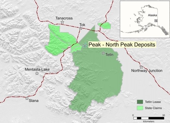 Located near Tok, Alaska, Peak Gold is accessible byroad and approximately 15 kilometers from the Alaska Highway. Peak Gold is situated within the approximate 675,000 acre (2,732 km2) mineral lease with the Village of Tetlin and contains is a high-grade skarn deposit that extends to surface. Additional exploration targets exist immediately adjacent to the identified resources at Main Peak and North Peak as well other targets on the large private land package.