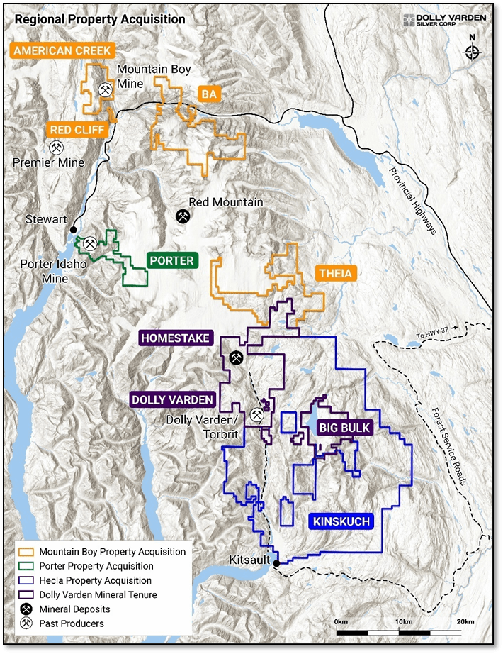 Vancouver, British Columbia – May 26, 2025 – Dolly Varden Silver Corporation (TSX-V: DV | NYSE-A: DVS | FSE: DVQ) (the “Company” or “Dolly Varden“) is pleased to announce that, further to its news release dated May 5, 2025, it has completed the acquisition of the Kinskuch Property in northwest BC’s Golden Triangle (the “Transaction”). The Kinskuch Property is adjacent to the Company’s Kitsault Valley Project and dramatically increases the Kitsault Valley Project size to approximately 77,000 hectares, covering some of the most underexplored and prospective rocks for silver, gold and copper mineralization in the Golden Triangle.