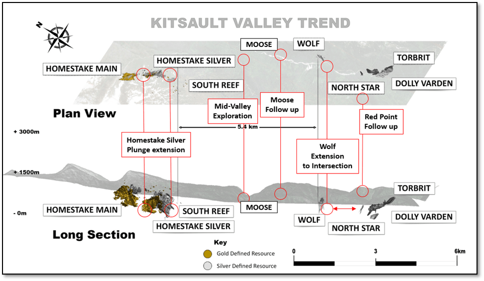 Exploration targets on both the Homestake Ridge and Dolly Varden properties include targets within the 5.4 km long area between the southern end of Homestake Silver and Wolf Vein, under the mid-valley sedimentary cap rocks. Additionally, geophysical targets west of the Homestake Main deposit will be tested, within parallel basin bounding structures similar to those hosting the Homestake Main and Homestake Silver deposits.