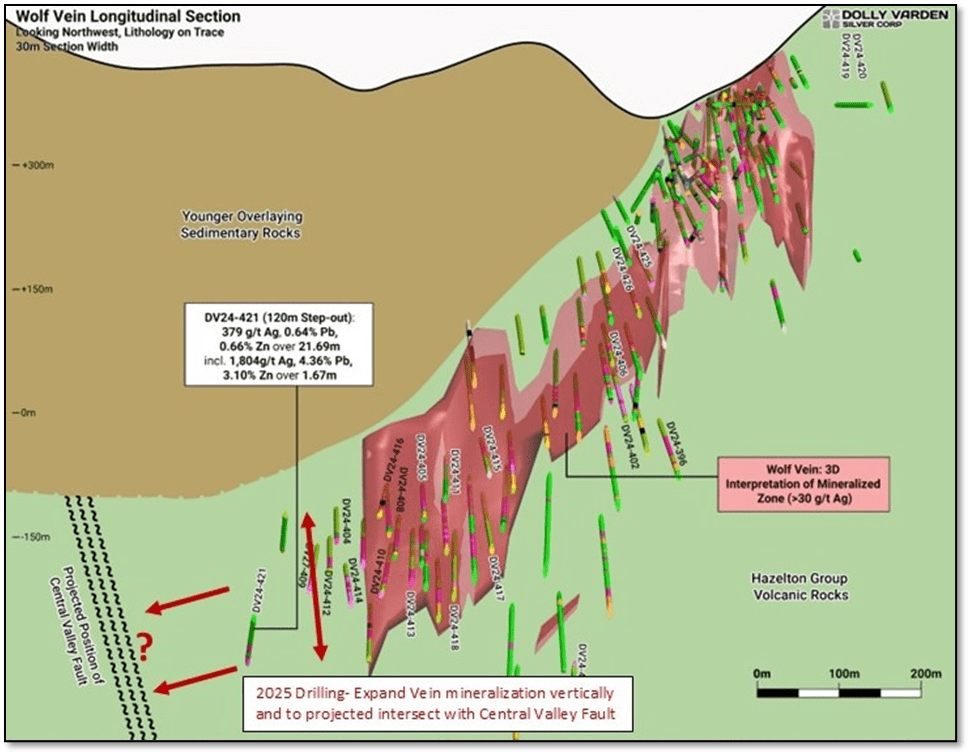 At the Wolf Vein drilling will target the extension of the southwesterly plunging, high grade silver corridor along strike and at depth, with the aim to further expand the zone. Directional drilling technology will again be employed to accurately intersect the steeply dipping vein with priority on aggressive step outs from the furthest west step out drill hole from 2024, DV24-421 that intersected 379 g/t Ag, 0.64%Pb and 0.66% Zn over 21.69 meters, including 1,804 g/t, 4.36% Pb and 3.10% Zn over 1.67 meters (from previous release: January 7, 2025).