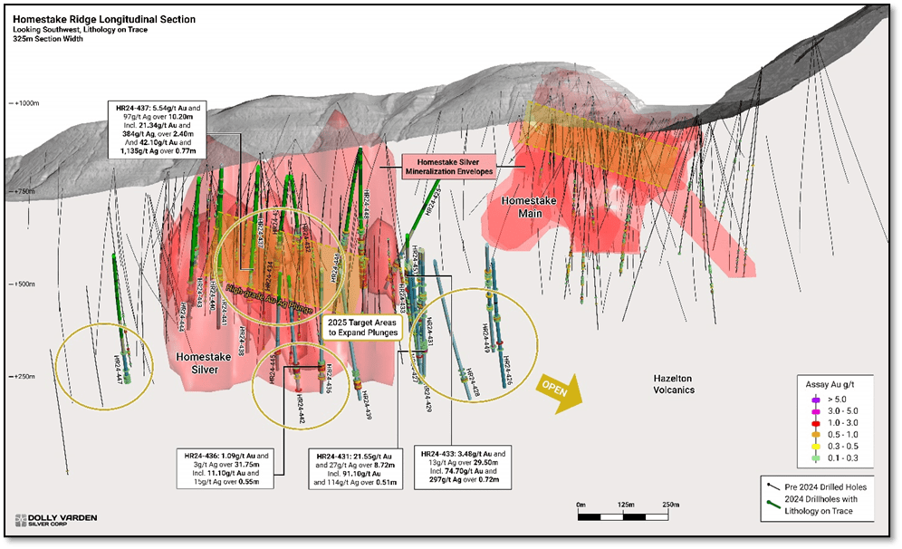 Figure 3. Homestake Ridge Longitudinal section looking southwest highlighting previous 2024 results of wide, high-grade plunge and gold zone at Homestake Silver with 2025 target areas. (results shown from previous release February 3, 2025)