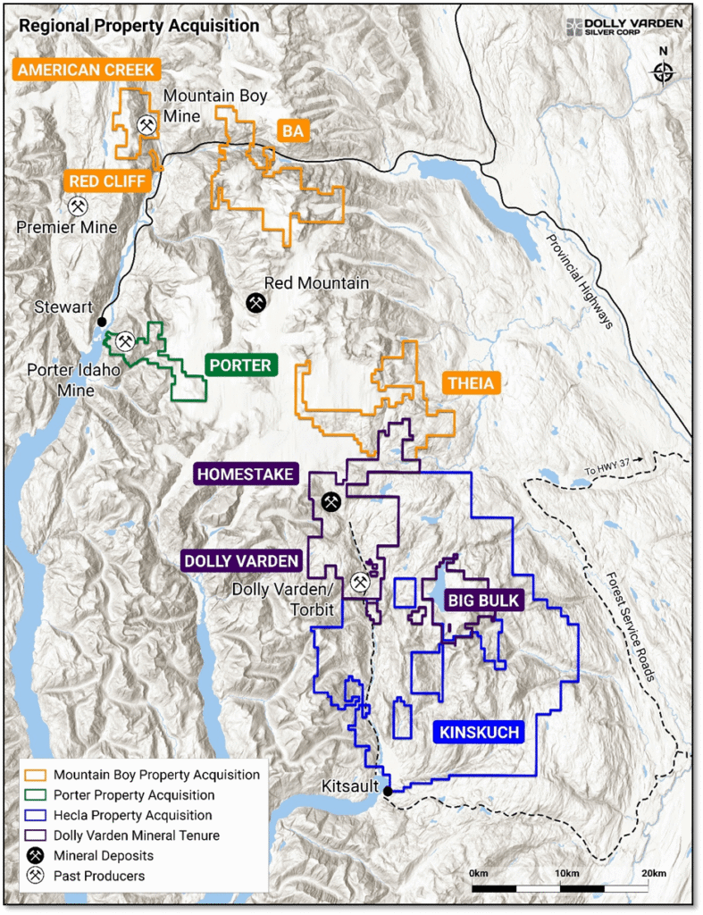 Vancouver, British Columbia – May 15, 2025 – Dolly Varden Silver Corporation (TSXV: DV | NYSE: DVS | FRA: DVQ) (the “Company” or “Dolly Varden”) is pleased to announce that it has entered into a definitive agreement with MTB Metals Corp. (“MTB Metals”) to acquire MTB Metals’ interests in four properties totaling over 20,000 hectares (collectively, the “Properties”), in the Golden Triangle, further strengthening Dolly Varden’s ground position in thVancouver, British Columbia – May 15, 2025 – Dolly Varden Silver Corporation (TSXV: DV | NYSE: DVS | FRA: DVQ) (the “Company” or “Dolly Varden”) is pleased to announce that it has entered into a definitive agreement with MTB Metals Corp. (“MTB Metals”) to acquire MTB Metals’ interests in four properties totaling over 20,000 hectares (collectively, the “Properties”), in the Golden Triangle, further strengthening Dolly Varden’s ground position in the region. These include American Creek Property (consisting of Mountain Boy Property, Silver Crown Property, and Dorothy Property), the Theia Property, the BA Property, and the Red Cliff Property. Three of these properties have road access, are proximal to power and are proximal to the recently completed Premier gold-silver mill near the port of Stewart, BC.