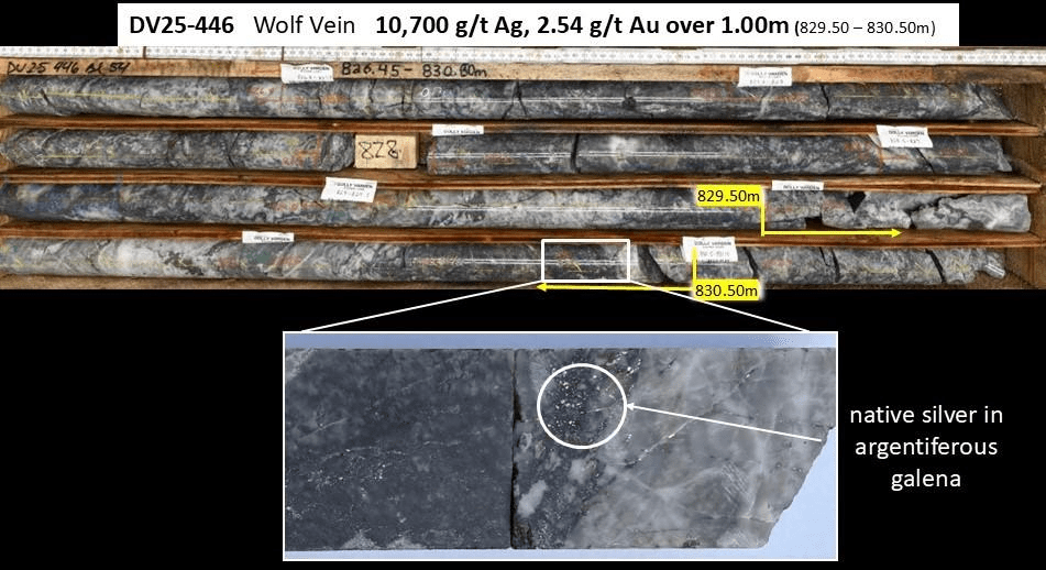 The Company is using directional drilling technology to precisely target areas for step-out and infill work at both Wolf and Homestake Silver. Drillhole DV25-446 is a deflection hole (daughter hole) off the initial “mother” hole drilled from the north at surface from which four additional holes were directed off at depths near the base of the sedimentary cap. The vein intercept in DV25-446 is approximately 105 meters up plunge (in-fill) from the 2024 step out DV24-421.