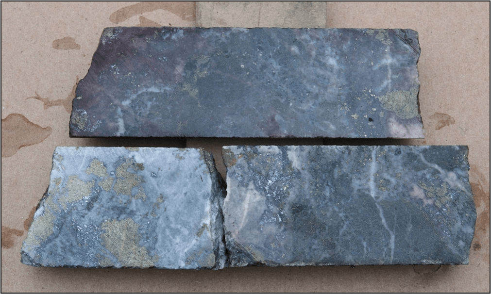 Figure 3. Core from Homestake Silver hole HR25-456. Mineralization hosted in multi phase vein and vein breccias with strong pyrite, chalcopyrite, galena, sphalerite and visible gold.