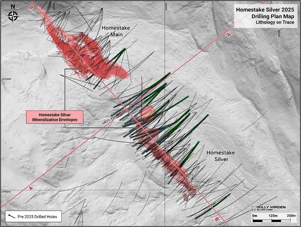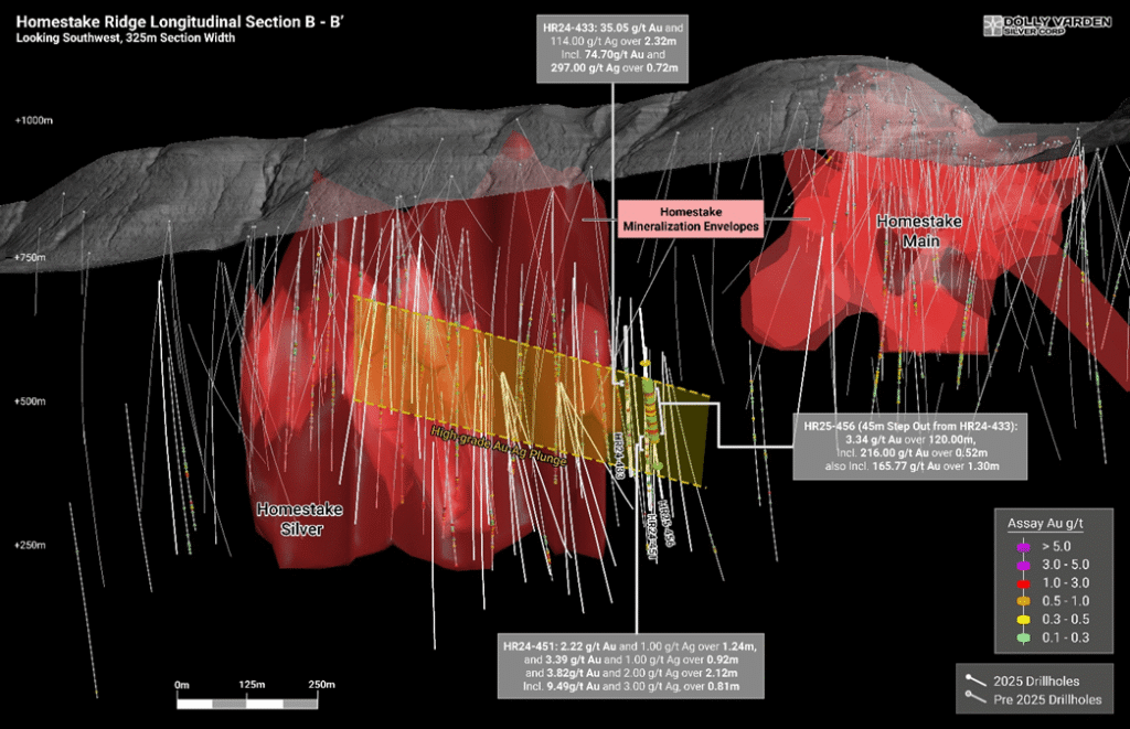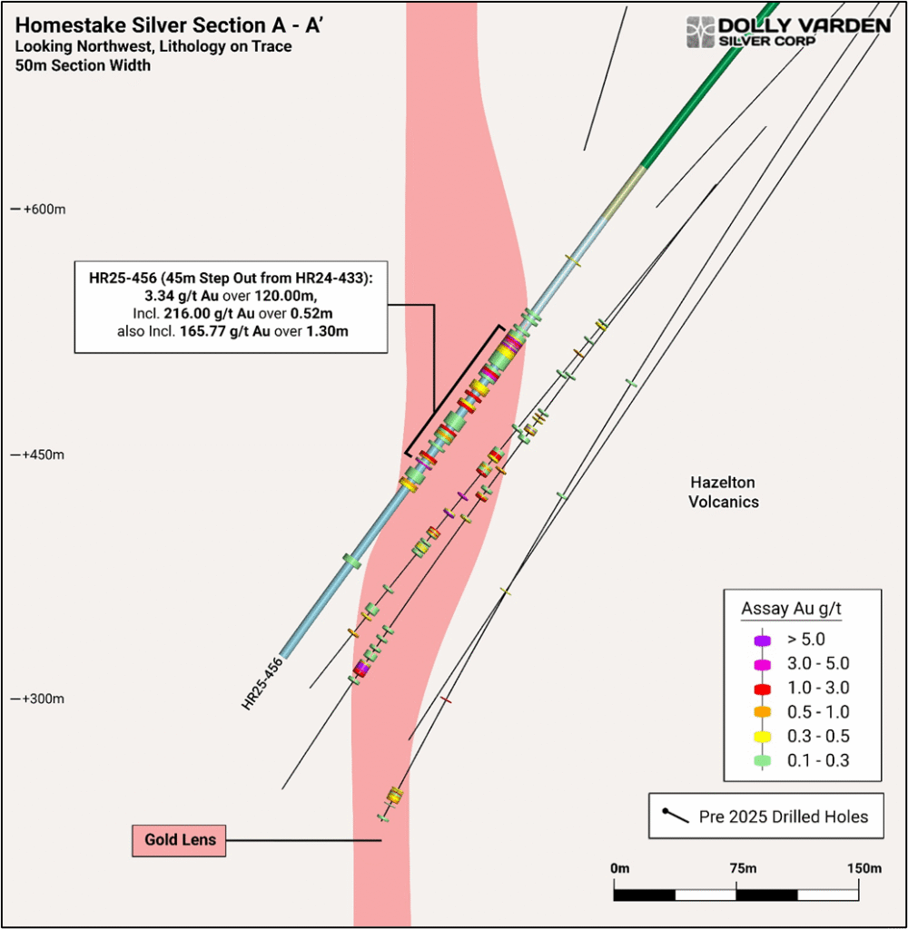 VANCOUVER, BC, October 01, 2025, Dolly Varden Silver Corporation (TSX-V: DV | NYSE MKT: DVS | FSE: DVQ) (the “Company” or “Dolly Varden“) is pleased to report a significant gold intercept from a 2025 step-out drill hole at the Homestake Silver deposit. Hole HR25-456 intersected 3.34 g/t Au over 120 meters, including 216 g/t Au over 0.52 meters and 166 g/t Au over 1.3 meters. The hole is a 45-meter step-out along strike from hole HR24-433 and 30 meters up dip from hole HR24-451 (both holes previously released February 3, 2025) confirming both continuity and growth potential outside of current Mineral Resources. Approximately 40% of the 2025 seasons 55,000 meter planned drill program at the Company’s 100% owned Kitsault Valley Silver and Gold Project targeted the Homestake Silver Deposit to expand and infill zones of high-grade gold mineralization. The deposit remains open for expansion, with gold mineralization vectoring to the Homestake Main Deposit, along strike to the north of the Homestake Silver Deposit.
