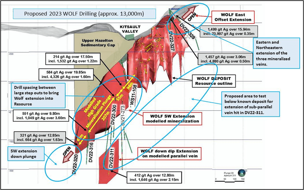 Similar step out drilling will follow up on high grade silver mineralization at the Kitsol Vein, where drill hole DV22-323 demonstrated the continuity of steeply plunging, high-grade silver mineralization with results of 301g/t Ag, 0.23 %Pb, 0.56% Zn over 15.00 meters (9.60 meters estimated true width) including 434 g/t Ag, 0.41% Pb, 0.69% Znover 5.90 meters (3.78 meters estimated true width).