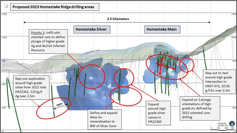 Drilling at Homestake Silver will prioritize step out holes where 2022 expansion drilling had success at the southern extent, with HR22-362, a 200 meter step out that intersected 1,252 g/t Ag, 0.81 g/t Au and 0.14% Cu over 2.50 meters, including 3,330 g/t Ag, 0.75 g/t Au and 0.38% Cu over 0.75m.