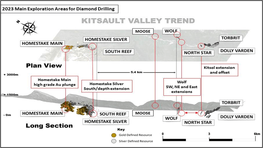 VANCOUVER, BC, April 24, 2023 – Vancouver, BC: Dolly Varden Silver Corporation (TSXV: DV) (OTC: DOLLF) (the “Company” or “Dolly Varden“) announces the 2023 Exploration Plans for the Kitsault Valley Project, which includes the Dolly Varden Silver property and Homestake Ridge Gold Silver property. A total of 40,000 to 45,000m of drilling is planned to build upon last year’s successes through further step outs following high grade silver and gold mineralization at the Wolf and Homestake Ridge deposits, as well as appropriately spaced exploration holes to allow the inclusion of new mineralization drilled over the past three drilling programs to be include in an updated Mineral Resource Estimate.