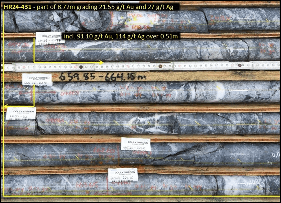 - HR24-431: Step out to north: 21.55 g/t Au and 27 g/t Ag over 8.72 meters, including 47.92 g/t Au and 58 g/t Ag over 3.74 meters and including 91.1 g/t Au and 114 g/t Agover 0.51 meters