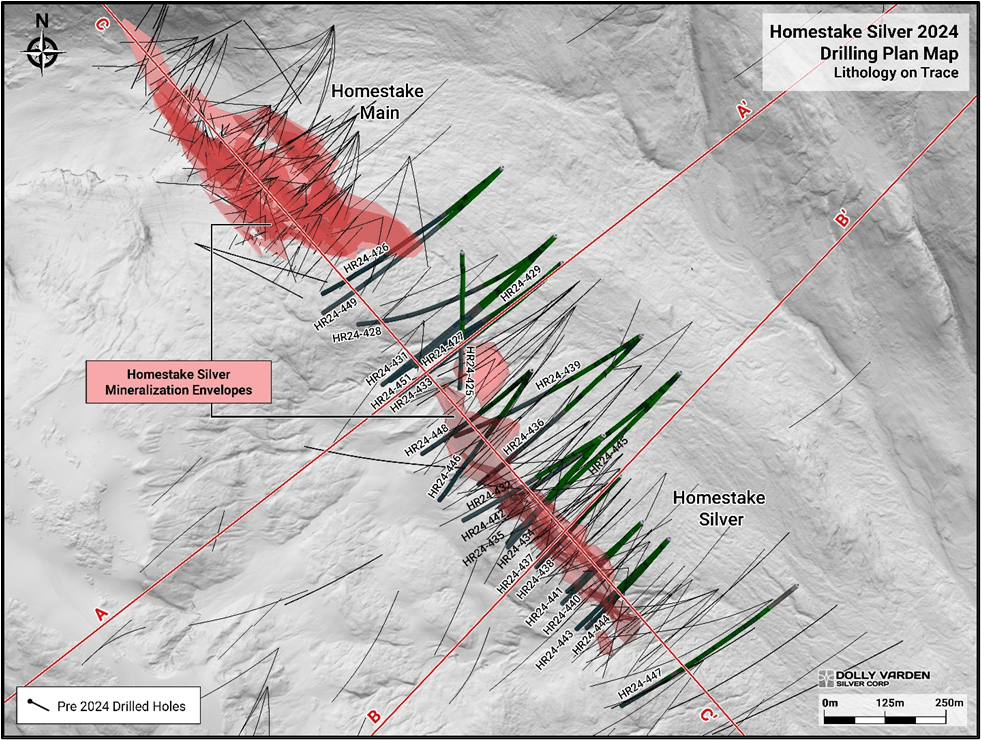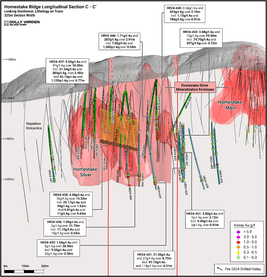VANCOUVER, BC, February 03, 2025 – Vancouver, BC: Dolly Varden Silver Corporation (TSXV: DV) (OTC: DOLLF) (the “Company” or “Dolly Varden“) is pleased to announce drill results from its 2024 program at the Homestake Silver deposit and exploration drilling at the Homestake Ridge Property in BC’s Golden Triangle. The twenty (20) drillholes reported in this release have successfully expanded and infilled multiple high-grade gold and silver-rich zones within the Homestake Silver Deposit. Three (3) drillholes reported in this release tested exploration targets across various prospects on the property. Dolly Varden’s 2024 drill program consisted of 69 drill holes for a total of 31,726m, with 41 holes totalling 15,546 meters drilled at the Dolly Varden area and 28 holes totalling 16,181 meters drilled at Homestake Ridge area. Planning for the fully funded 2025 drill program is underway to build on the expanded silver and gold zones drilled in 2024.