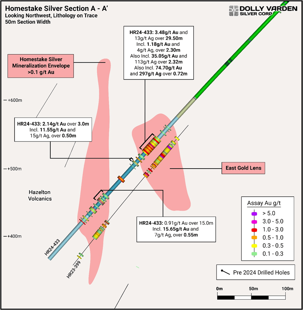 The other four drill holes testing the extent of the northern gold-rich zone all intersected a broad alteration zone with internal areas of strong veining and vein breccias. Drill hole HR24-433 intersected the new gold-rich zone to the east of the main Homestake Silver trend, grading 3.48 g/t Au and 13 g/t Ag over 29.50 meters and included higher grade vein intervals of 35.05 g/t Au and 114 g/t Ag over 2.32 meters (Figure 5). HR24-433 stepped out from previously released hole HR23-399, that intersected the new east gold lens grading 2.68 g/t Au and 20 g/t Ag over 57.70 metersand included higher grade vein intervals of 43.10 g/t Au and 66 g/t Ag over 1.01 meters and 40.33 g/t Au and 418 g/t Ag over 1.75 meters.(February 12, 2024, new release).
