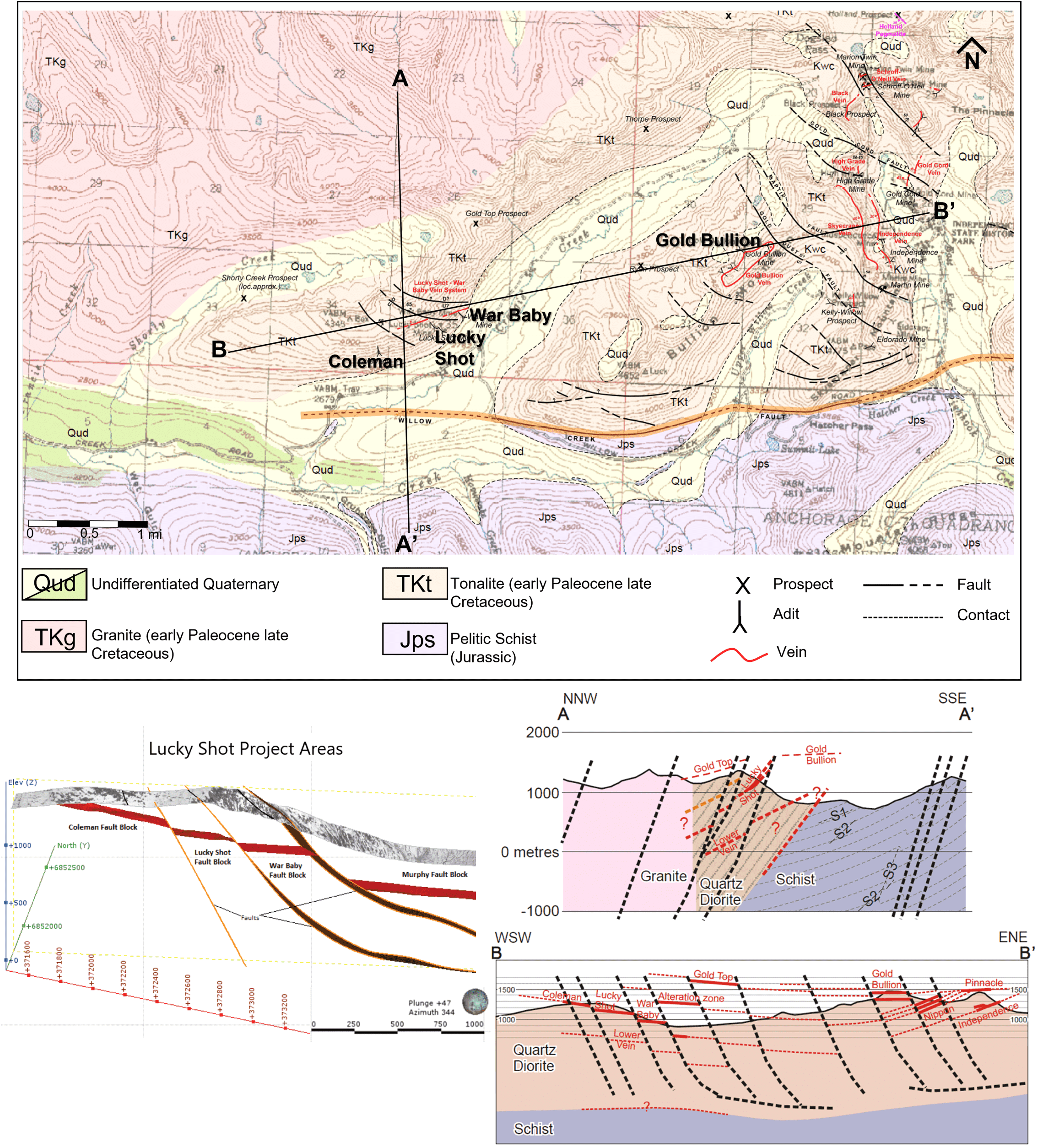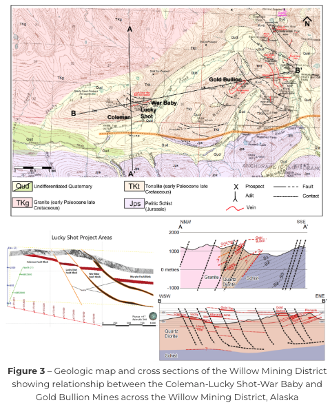 [1],[2] The Willow Creek Mining District is located in the southern Talkeetna Mountains of southcentral Alaska and covers an area of approximately 175 sq. km (68 sq. mi. – see Capps, S.R., 1915). The mining district straddles the margin of a granodiorite batholith that forms the Talkeetna Mountains and is bounded on the south by the Castle Mountain fault system (see Figure 3). Total gold production from the Willow Creek district through 1950 was reported to be 19 metric tonnes or approximately 610,874 troy ounces from ores ranging between 30 and 60 g/t (Harlan, et al., 2017) making it the third largest historic lode gold producing district in Alaska. Production from the Lucky Shot was reported to have been 252,000 oz from 169,000 tons of free-milling ore indicating an average head grade of 1.5 oz/ton (1.6 oz/tonne) (Stoll, 1997), with additional production from the Coleman and War Baby mines. The Lucky Shot vein system was determined to be continuous from the War Baby to the Coleman across the project area – approximately 1.6 kms (1 mile), with two high-angle faults structures segmenting the vein into three blocks (i.e., the Coleman block, Lucky Shot block and War Baby block). A third fault structure further east was determined to separate the War Baby block from drilling that intersected the vein structure in what is known as the Murphy block – extending the known vein structure another 600 meters (~2000’) further east (see Figure 3). Between the Coleman and War Baby mines the vertical and lateral offset is a few meters up to tens of meters which allowed historic mining to continue across faults in a near-continuous manner. This similar magnitude of vertical and lateral displacement is defined as an oblique-slip fault and is typical of a transpressional structural environment. District geologic mapping (Harlin et al., 2017 and several USGS Reports) show that the Castle Mountain fault is a major regional strike slip fault and that the Hatcher Pass Fault is a sympathetic fault that places a thick section of Cretaceous(?) schists up against a rigid body made up of the late Cretaceous Willow Creek batholith (see Figure 3). The Company believes the contact environment between these two disparate lithologies is an ideal location for low angle, listric fault-controlled quartz vein hosted gold deposits (Groves, D. I. et al, 1997), characteristic of the Willow district.