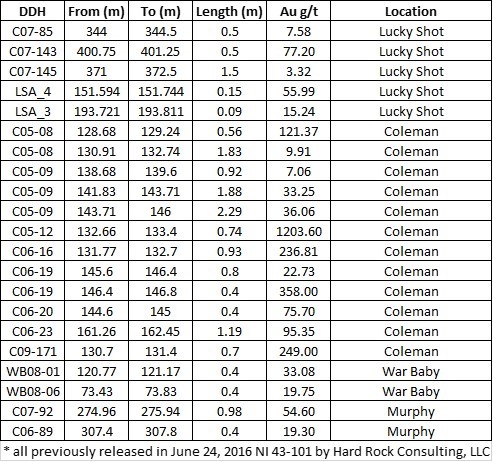 After the mines were shut down in 1942 because of the World War II effort, little happened on the property until the 1980s when Enserch Exploration conducted an extensive exploration program which included soil sampling, drilling, and underground exploration. Ensearch constructed a 457 m (1,500’) exploration adit below the Lucky Shot mine and drilled 11 underground core holes totaling 3,159 m (10,364’) and 7 surface core holes in the Coleman zone totaling 1,488m (4,881’) during the 1984 field season. From 2005-2009 Full Metals Minerals drilled a total of 34,103 meters (111,887’) in 173 core holes from surface along the Coleman-Lucky Shot-War Baby-Murphy trend. In 2016 Gold Torrent Inc. published a pre-feasibility report by Hardrock Consulting LLC based on an assessment of all historic work completed on the property (see Hard Rock Consulting PFS Report June 24, 2016). Figure 4 is a Table of selected drill hole results that demonstrate the exploration potential of the down-dip exploration potential along the 1.6 km (1 mile) Coleman-Lucky Shot-War Baby-Murphy trend (see Hard Rock Consulting PFS Report June 24, 2016).