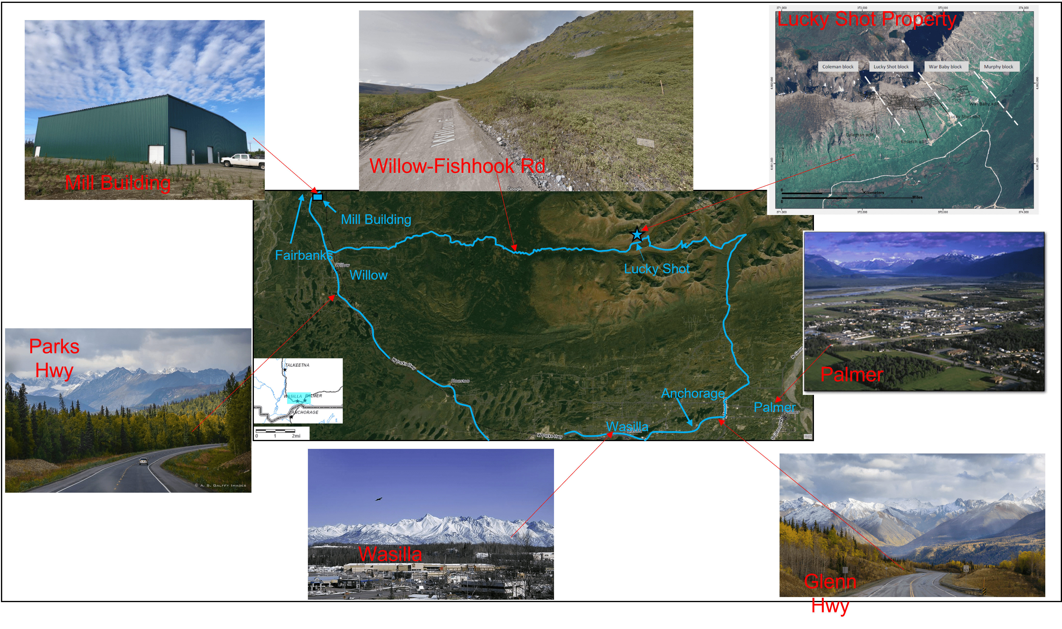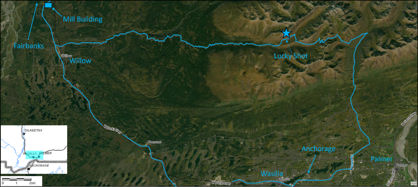 The Lucky Shot project consists of a mine site located 180 road kilometers (112 road miles) north of Anchorage, Alaska, and a processing site located about 48 road kilometers (30 road miles) west of the mine site (Figure 1). Infrastructure is excellent with road access between the mine site and plant site via unsealed secondary road, sealed 2-lane highway, and the 4-lane Parks Highway connecting Anchorage and Fairbanks.