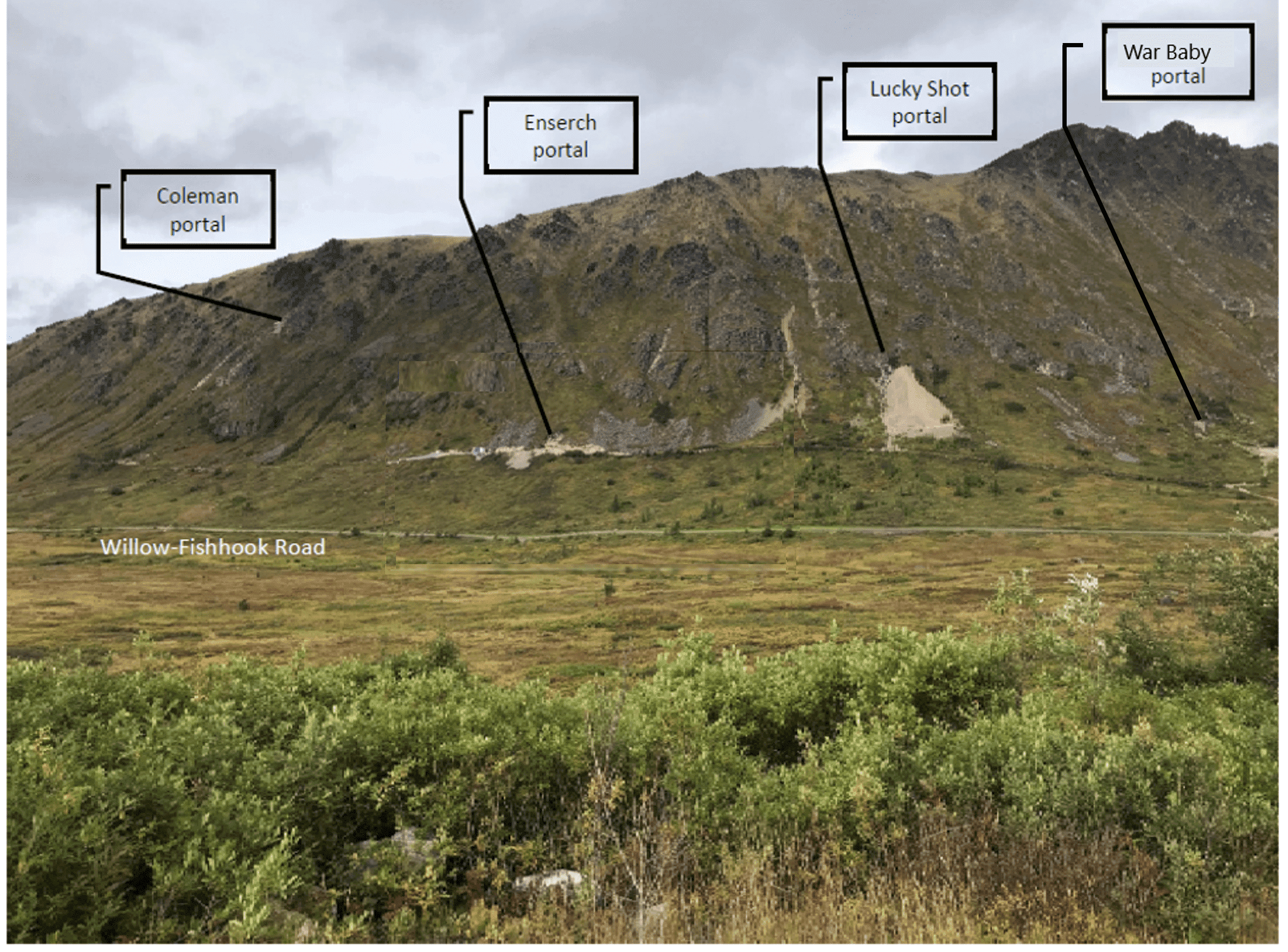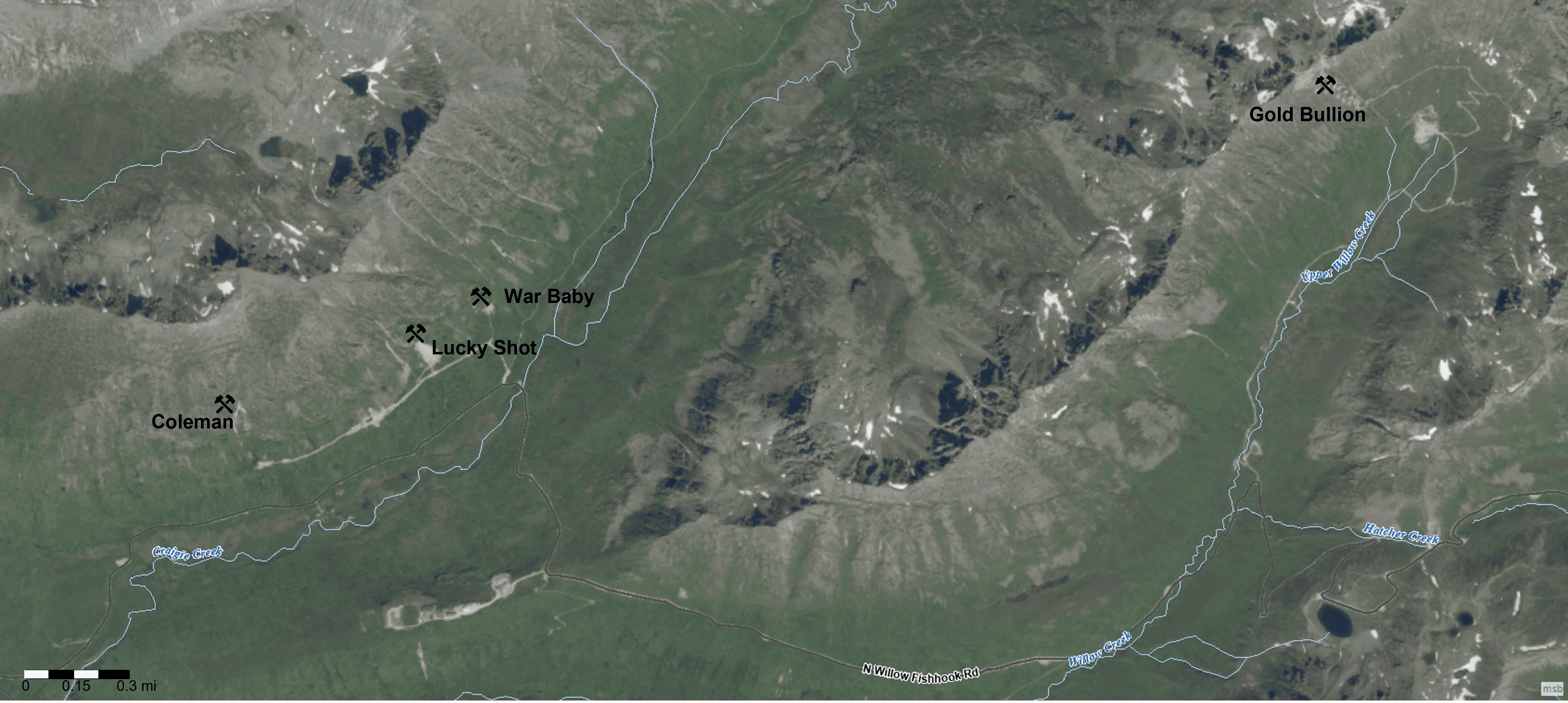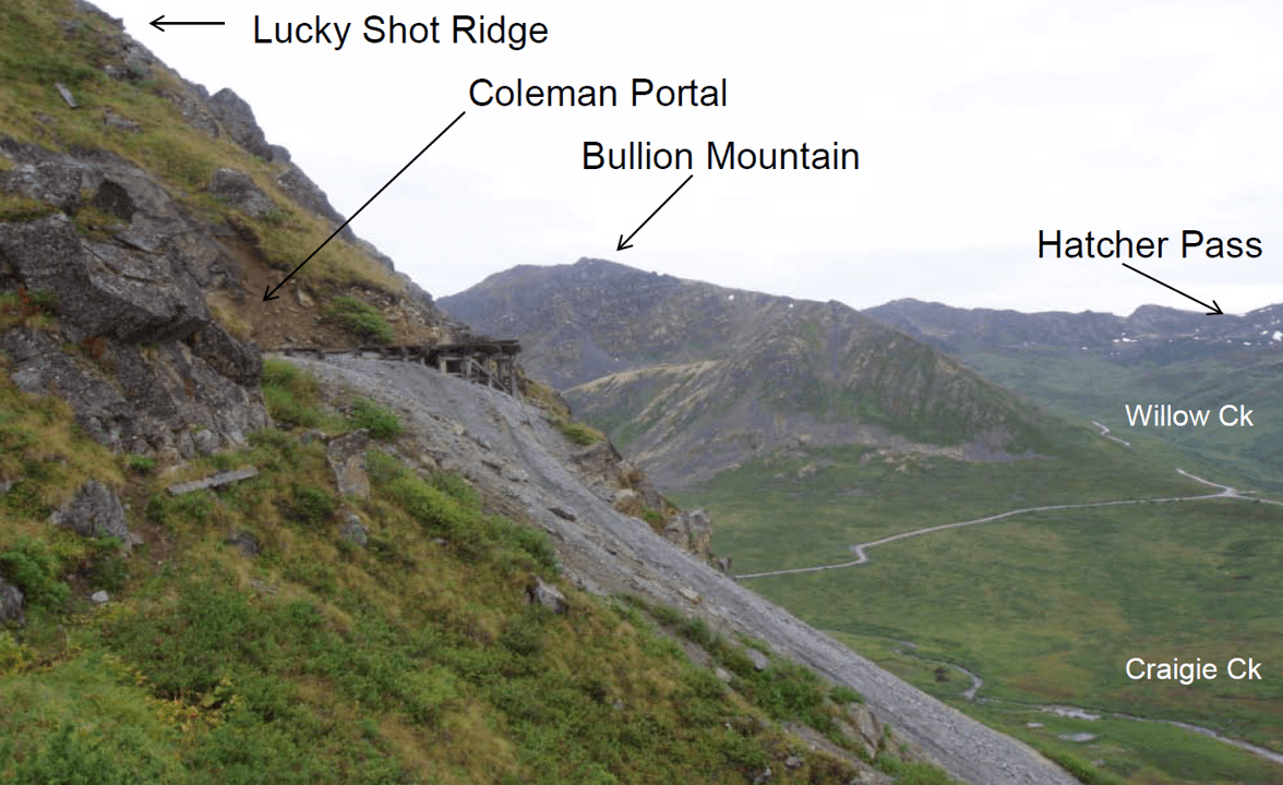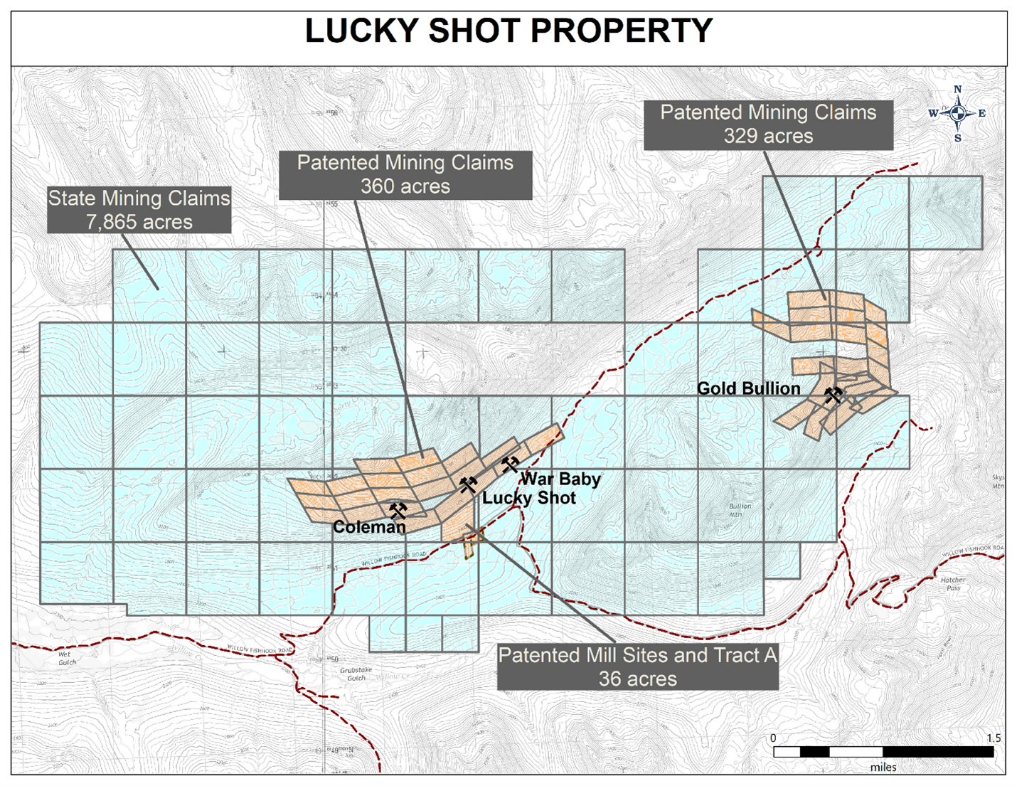 The Lucky Shot property includes 725 acres of patented mining claims and 7,865 acres of State of Alaska mining claims totaling approximately 8,590 acres which cover three former producing gold mines in the Willow Mining District located in south central Alaska (see Figures 1 and 2). The three former mines include the Coleman, Lucky Shot and War Baby mines located on the acquired mineral title. The Coleman, Lucky Shot and War Baby mines are located along a continuous low angle structural zone occupied by a series high-grade quartz vein hosting free gold and minor sulfide and telluride mineralization. The vein and structural corridor are hosted by a granodiorite composition intrusion of Cretaceous age (Lester, 2007).