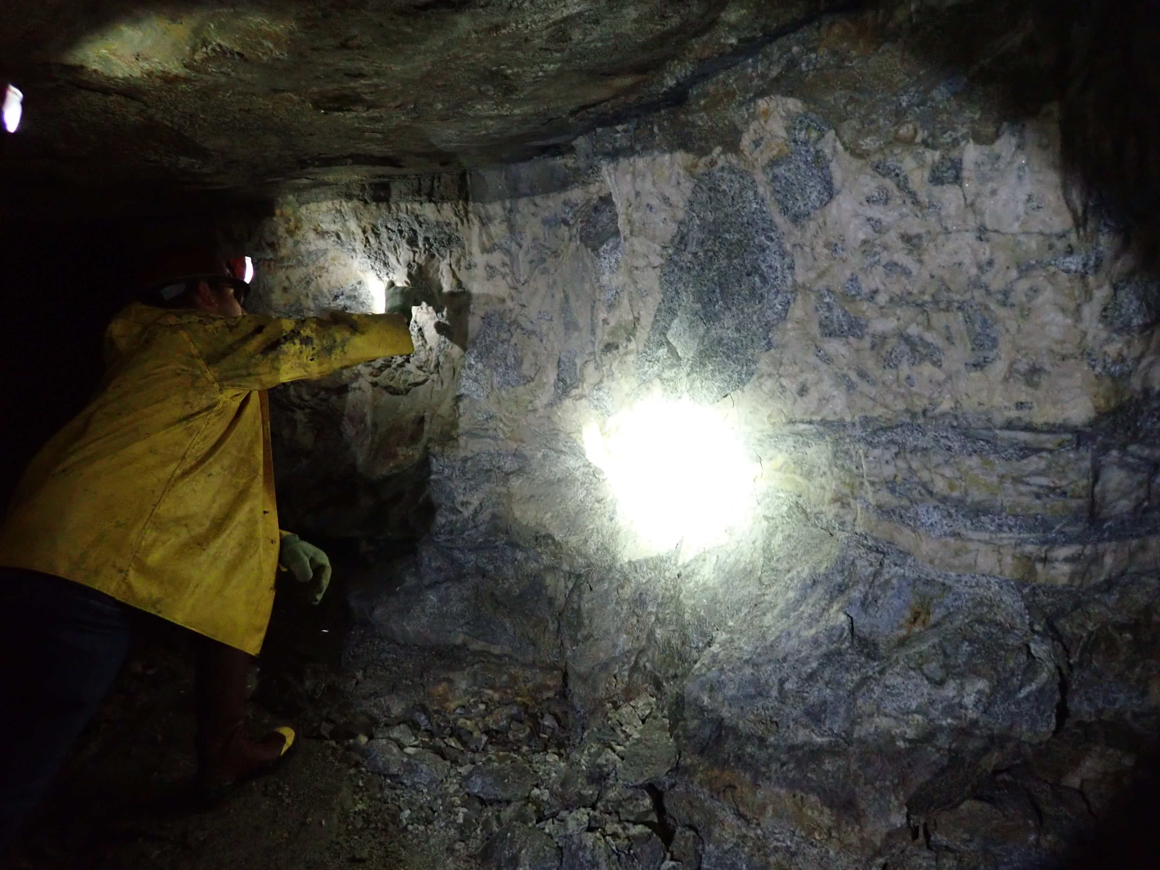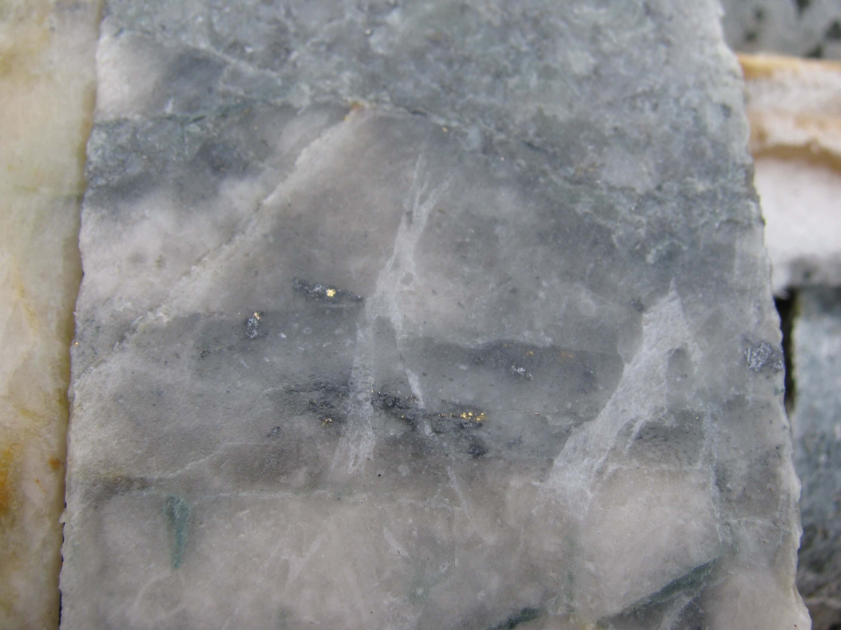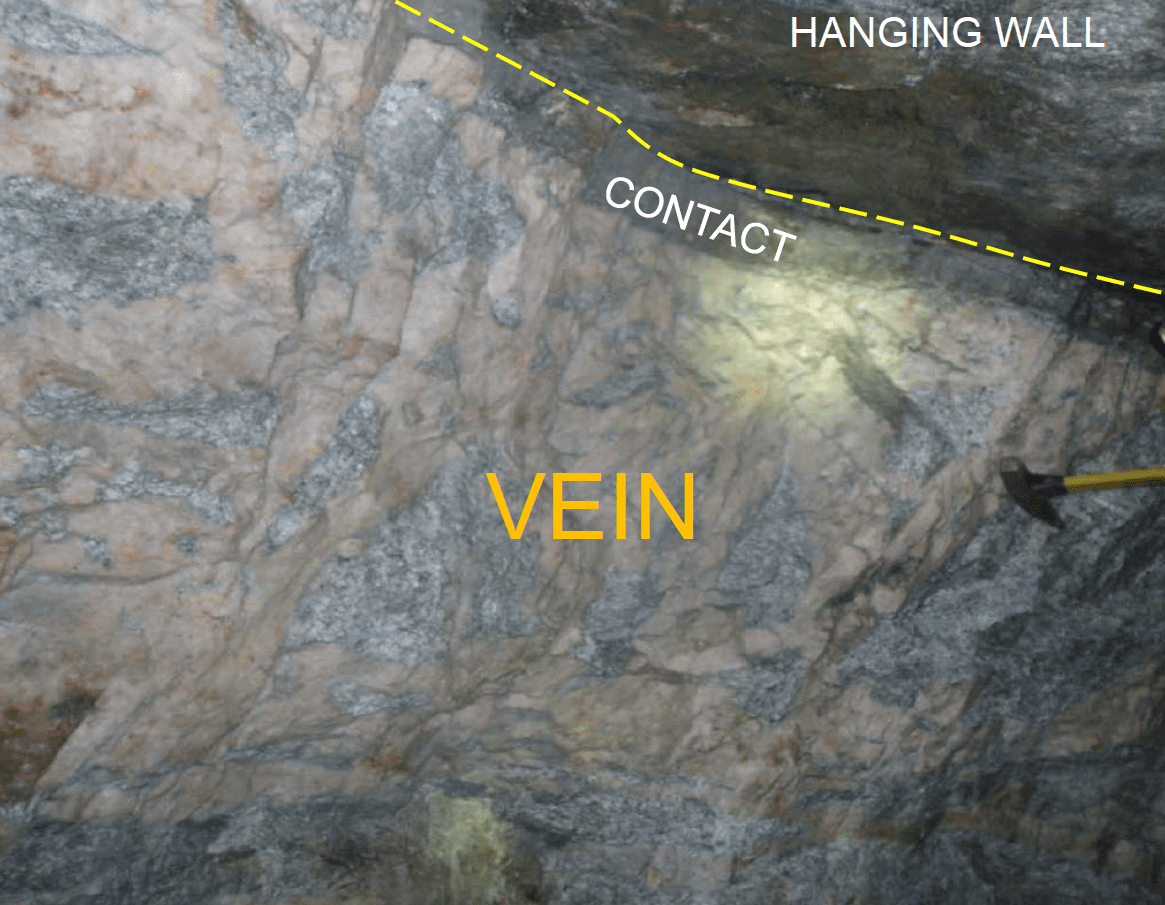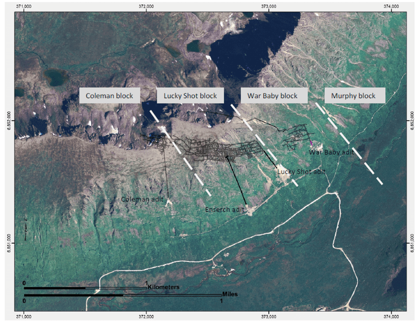The three historic mines at the Coleman, Lucky Shot and War Baby properties are controlled by a continuous low angle, listric fault zone occupied by a series of quartz veins and sheared breccia zones from 1 meter wide up to several meters in width. The veins are hosted by a granodiorite composition intrusive rock which is part of the Willow Creek batholith described earlier. The quartz veins are central to a broader alteration zone that extends tens of meters adjacent to the veins and consists of sericite, chlorite, albite, leucoxene and ankerite/siderite. The quartz veins contain native gold, pyrite, arsenopyrite, tetrahedrite-tennantite, sphalerite, galena, and various telluride minerals (coloradoite and nayagite have been identified – Lester, 2007).