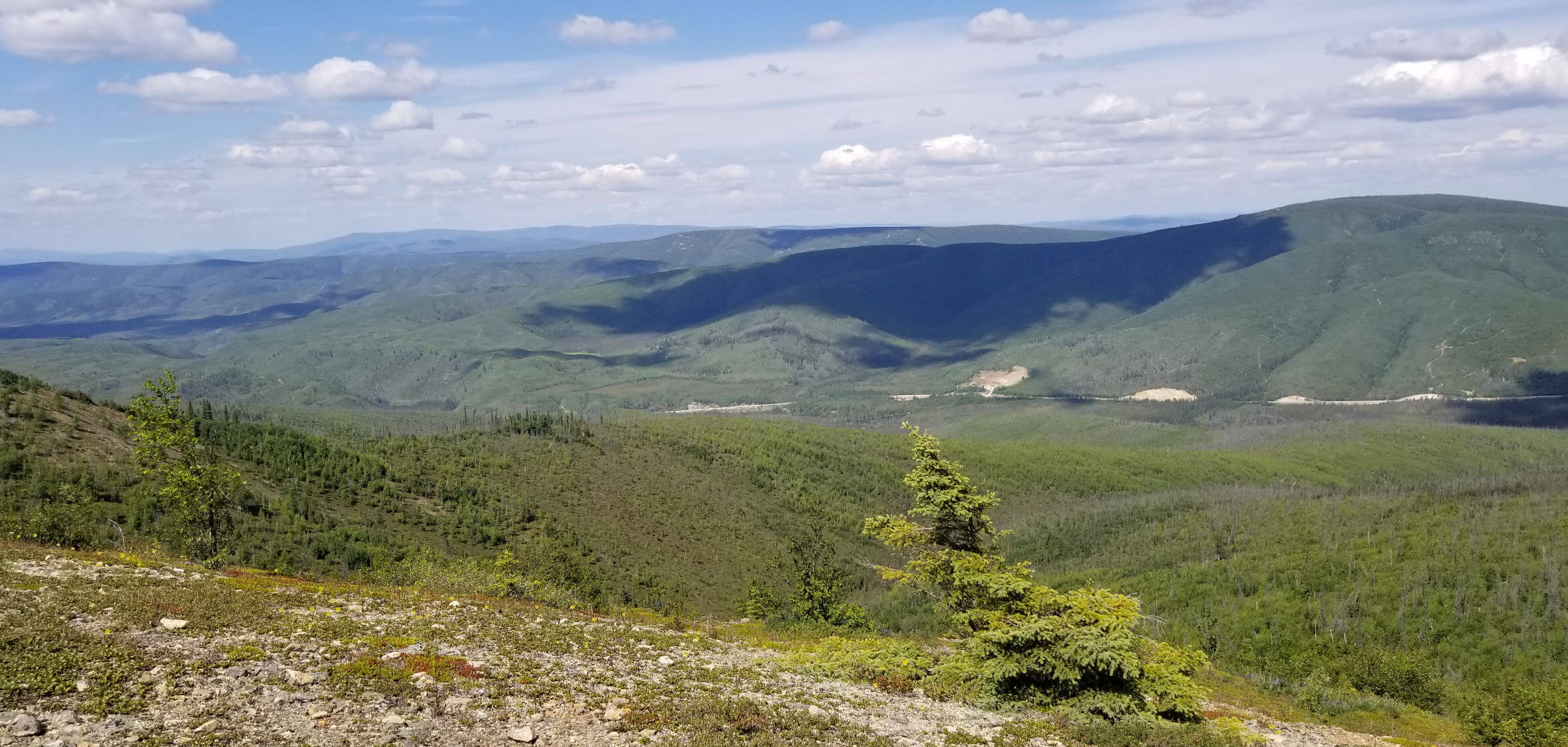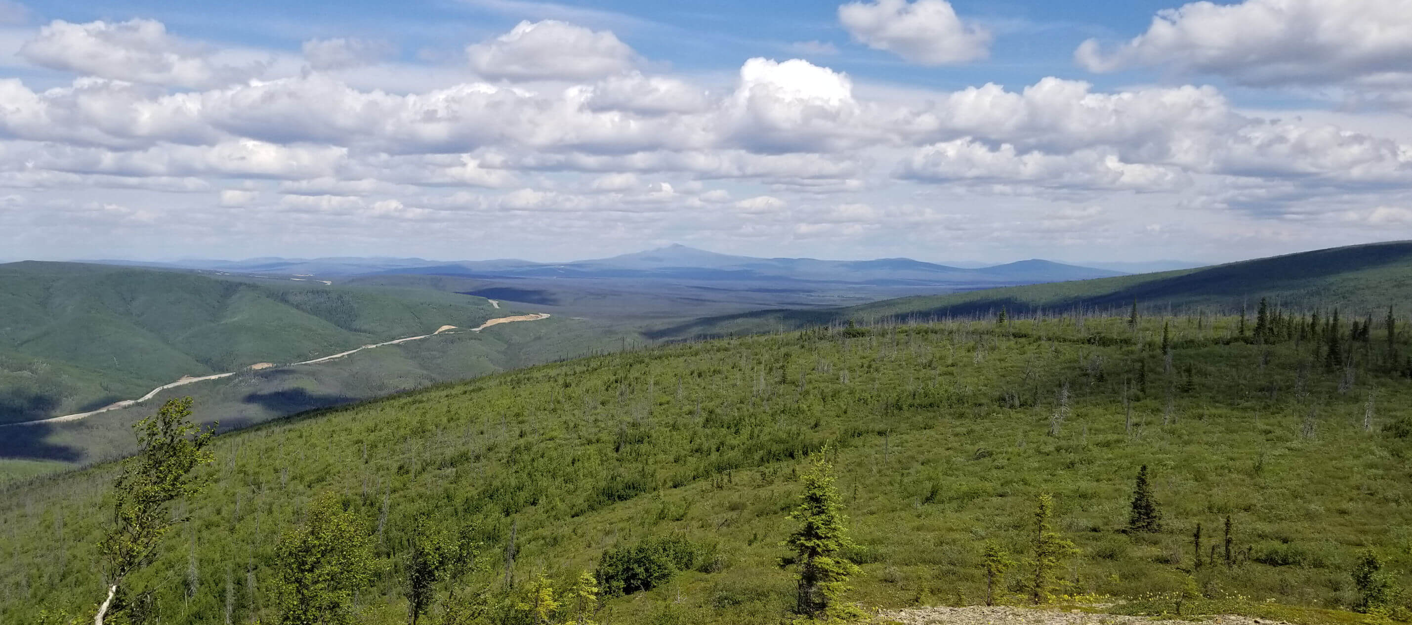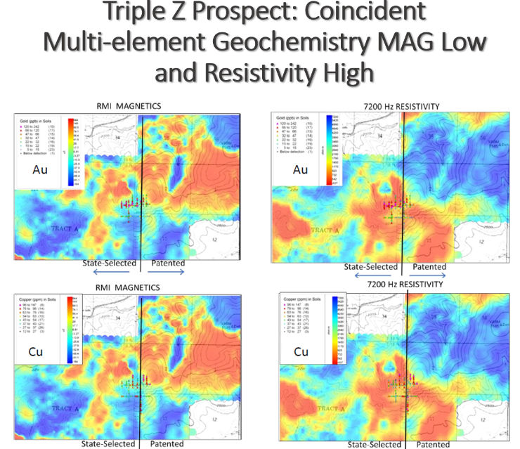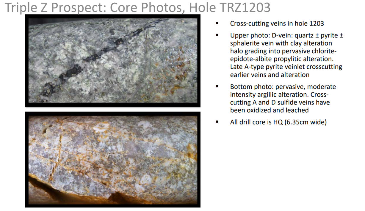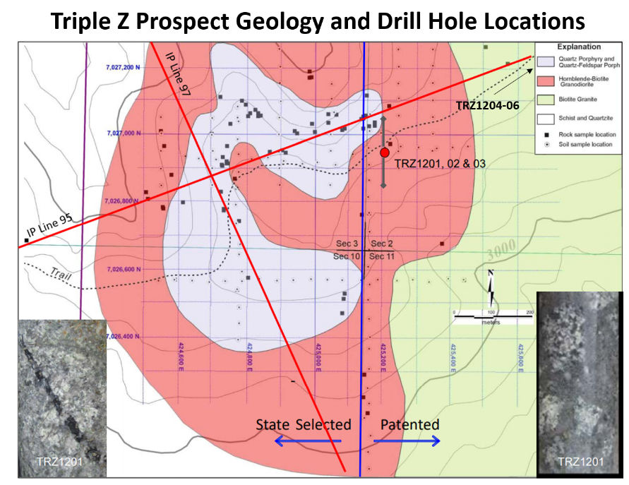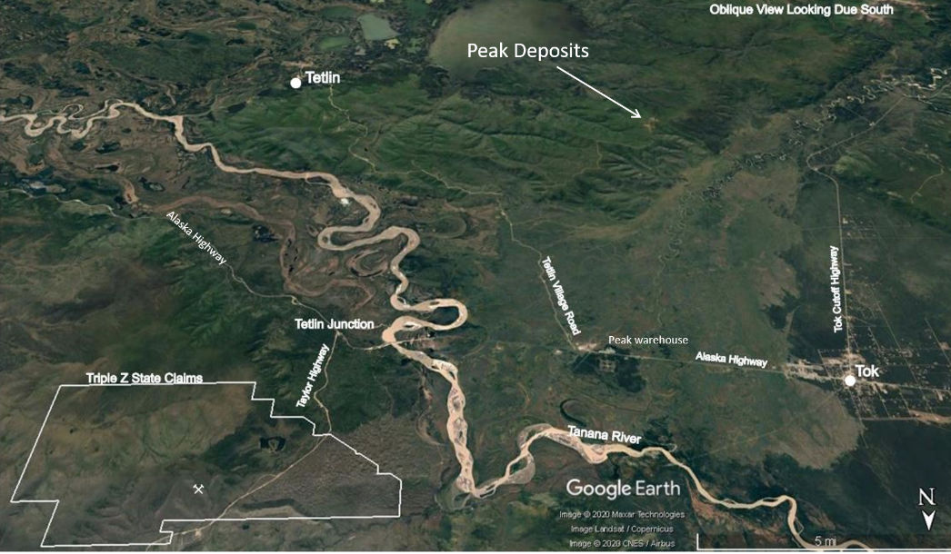 The Triple Z claims were staked in 2009 and the claim block expanded in 2011 and again in 2019, and now covers an area of 14,810 acres immediately adjacent to the Alaska Hwy to the south and west, and the Taylor Hwy to the north and east.  The Alaska Resource Data Files (ARDF) indicate the Triple Z prospect received limited surface exploration in 1970 and Cities Service Minerals Corp. completed three drill holes on the prospect in 1971. No technical details from this work are available in the public domain. Inquiries with Kinross Gold, the assumed current owner of the 1970’s-vintage work, indicate that these records have not survived.