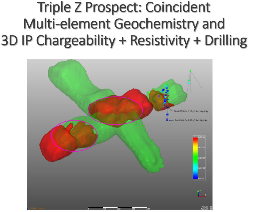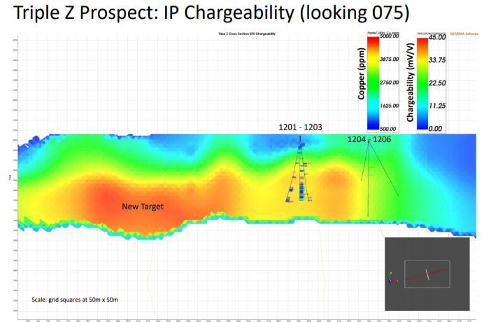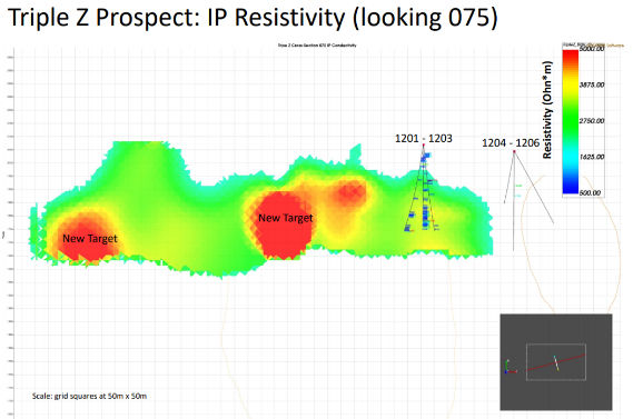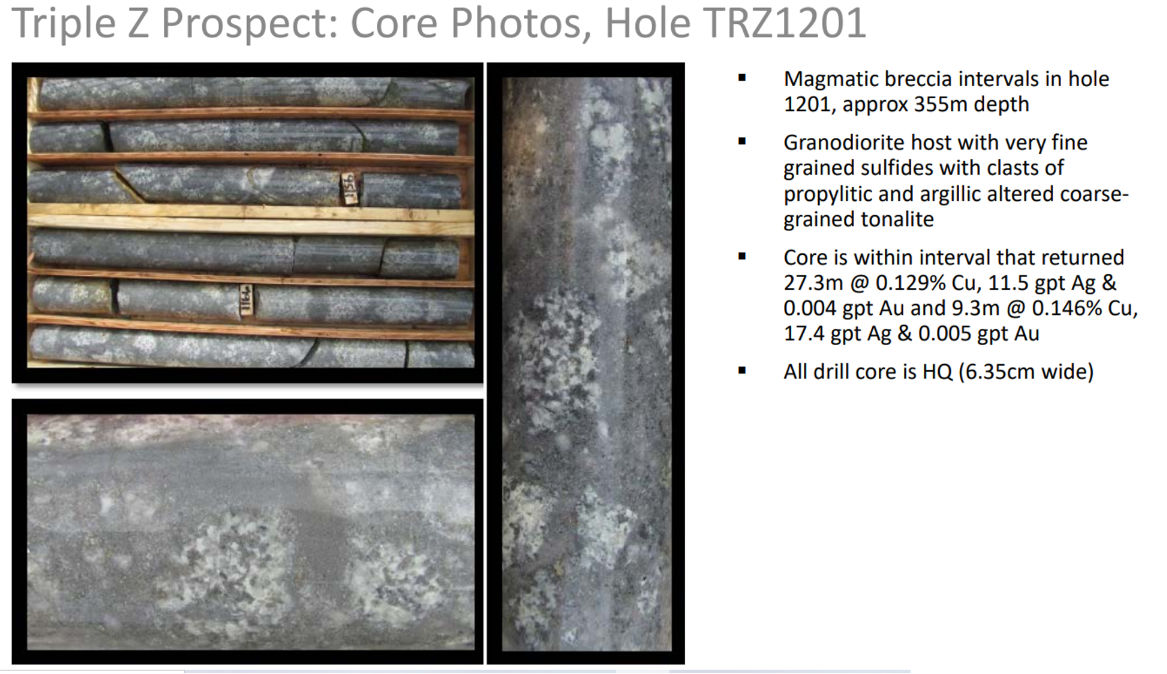 To date the main targets have not yet been drilled because we are waiting for a land transfer to be completed between the Federal Government (Bureau of Land Management – BLM) and the State of Alaska.  This is part of a process that has been on-going since Statehood.  We have been working with the State and Federal agencies to prioritize this transfer because of the highly prospective drill-ready target.  Drilling was completed in 2012 (before the IP survey) with 6 core holes drilled to depths ranging from 230 meters (755 ft.) to 380 meters (1246 ft.).  Holes 1202 and 1204 encountered several zones of anomalous copper, gold and silver.
